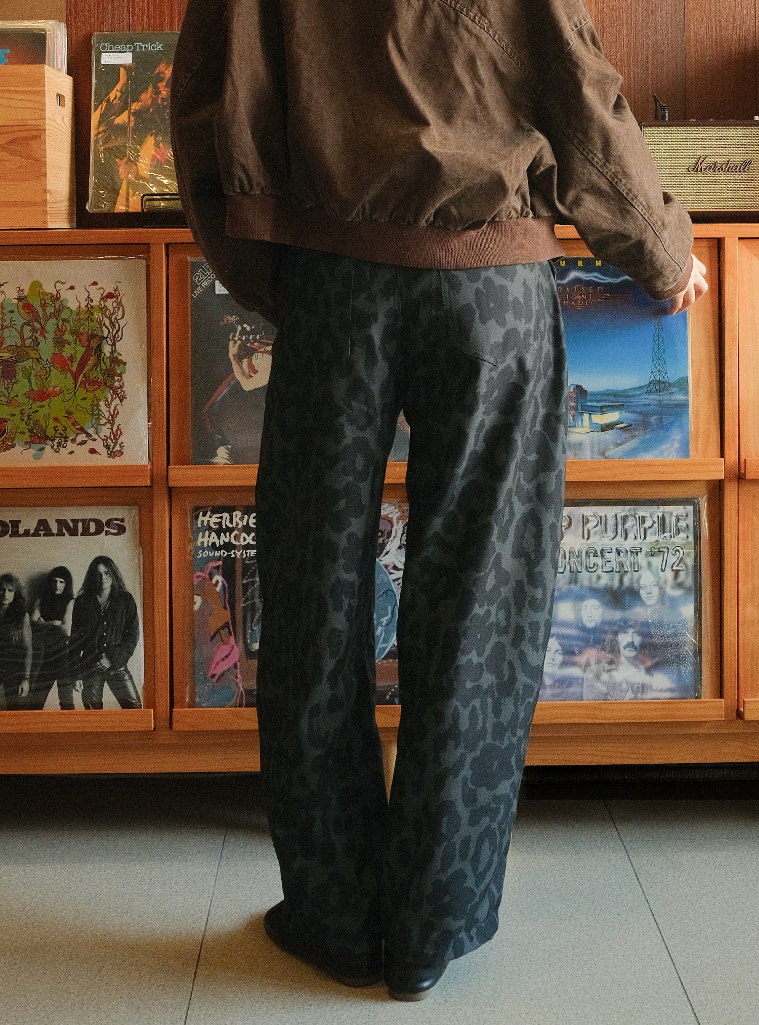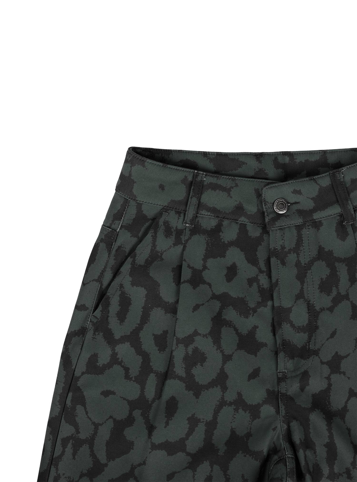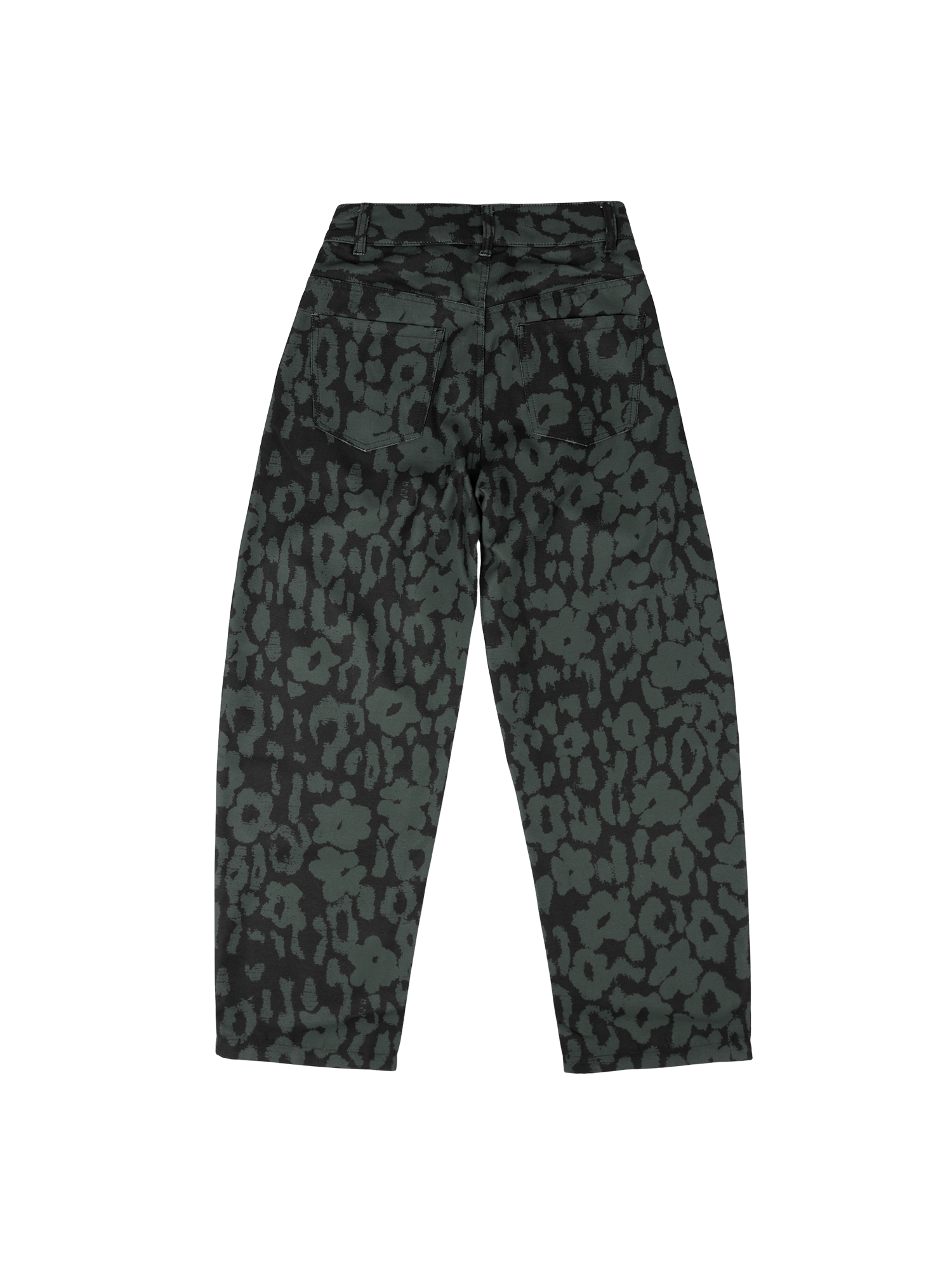 A unisex barrel-shaped pants with a subtle twill texture with a mid-rise fit, finished with a leopard-floral pattern and front and back pockets.