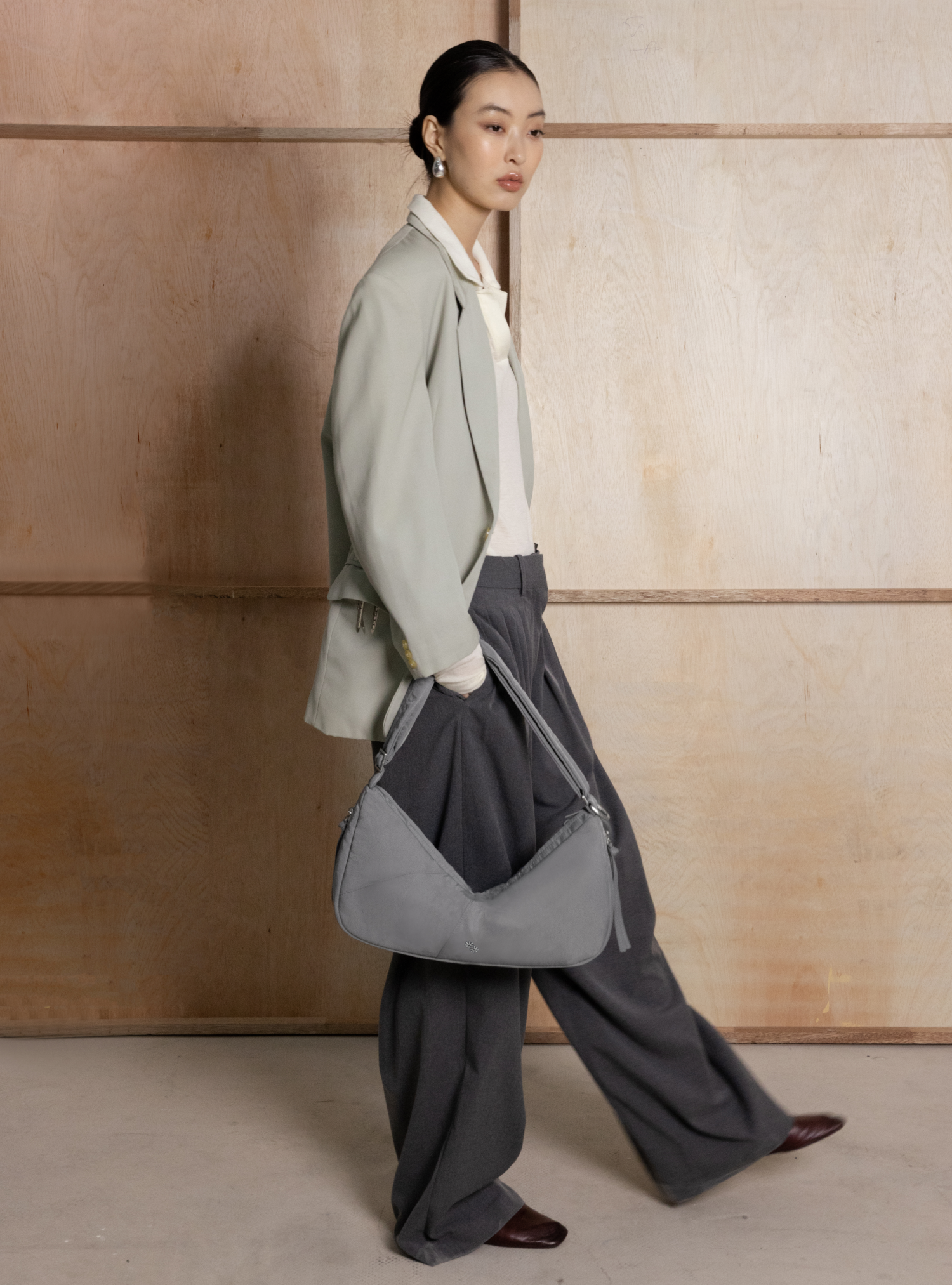 Inspired by sculptural forms, The Vessel combines design and function with an elongated V-shaped silhouette, built-in charm clip, side pockets, roomy interior, and adjustable strap for versatile everyday wear.