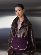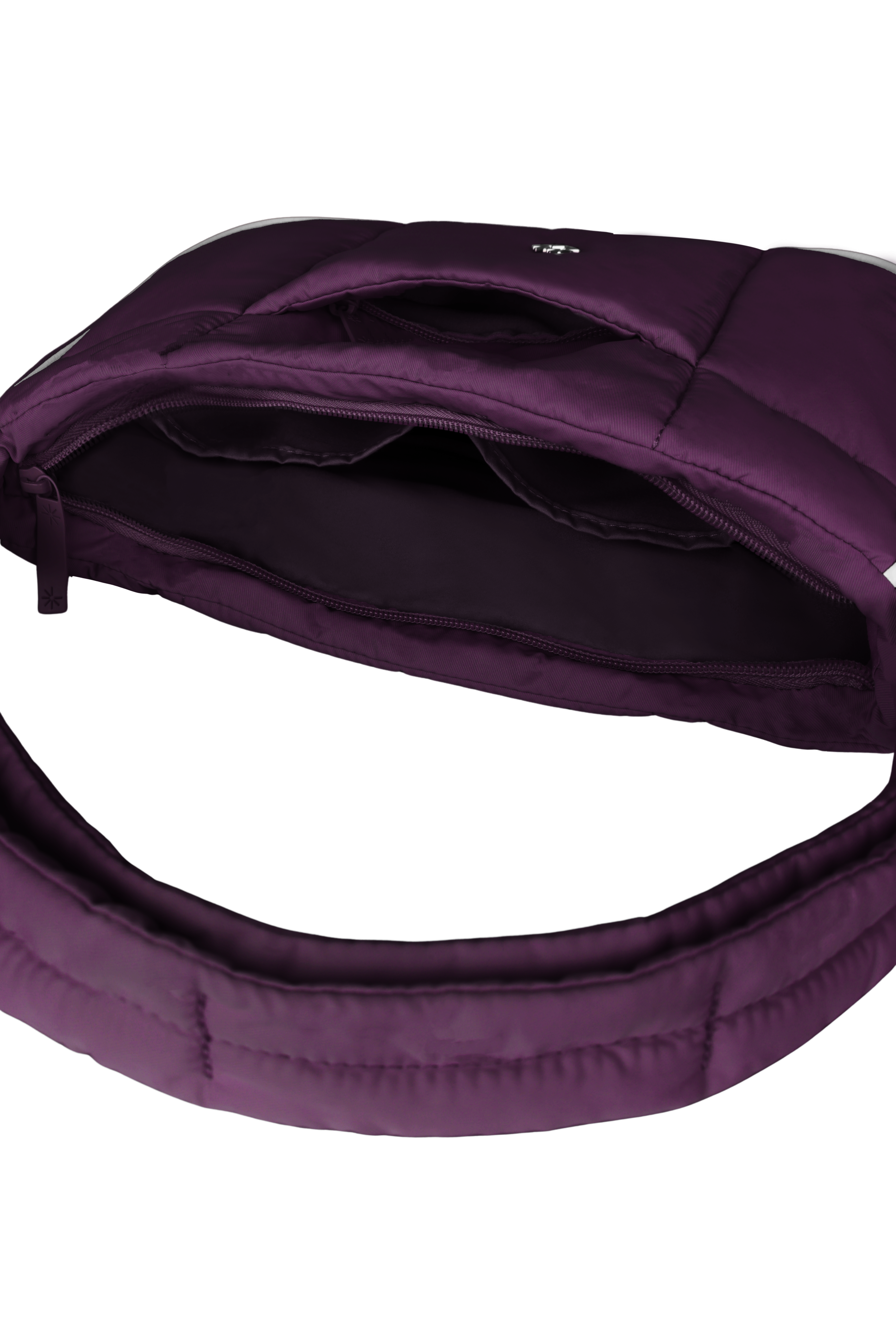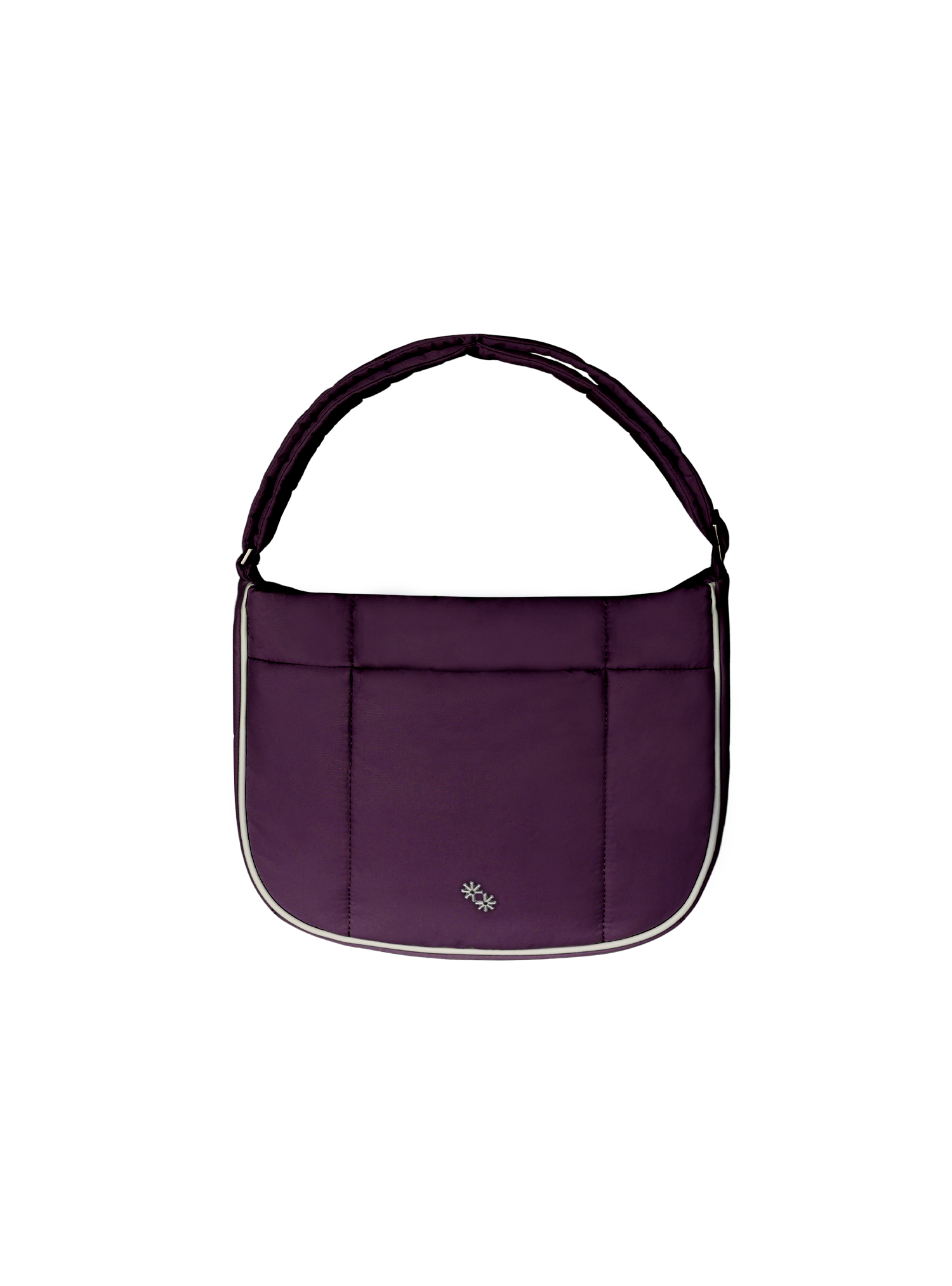 This Puffer Swing is an 80s-inspired shoulder bag made with smooth nylon, outlined in cream vegan leather piping for a refined, structured finish. Fits your daily essentials (even a water bottle and iPad), with interior and exterior zip pockets.